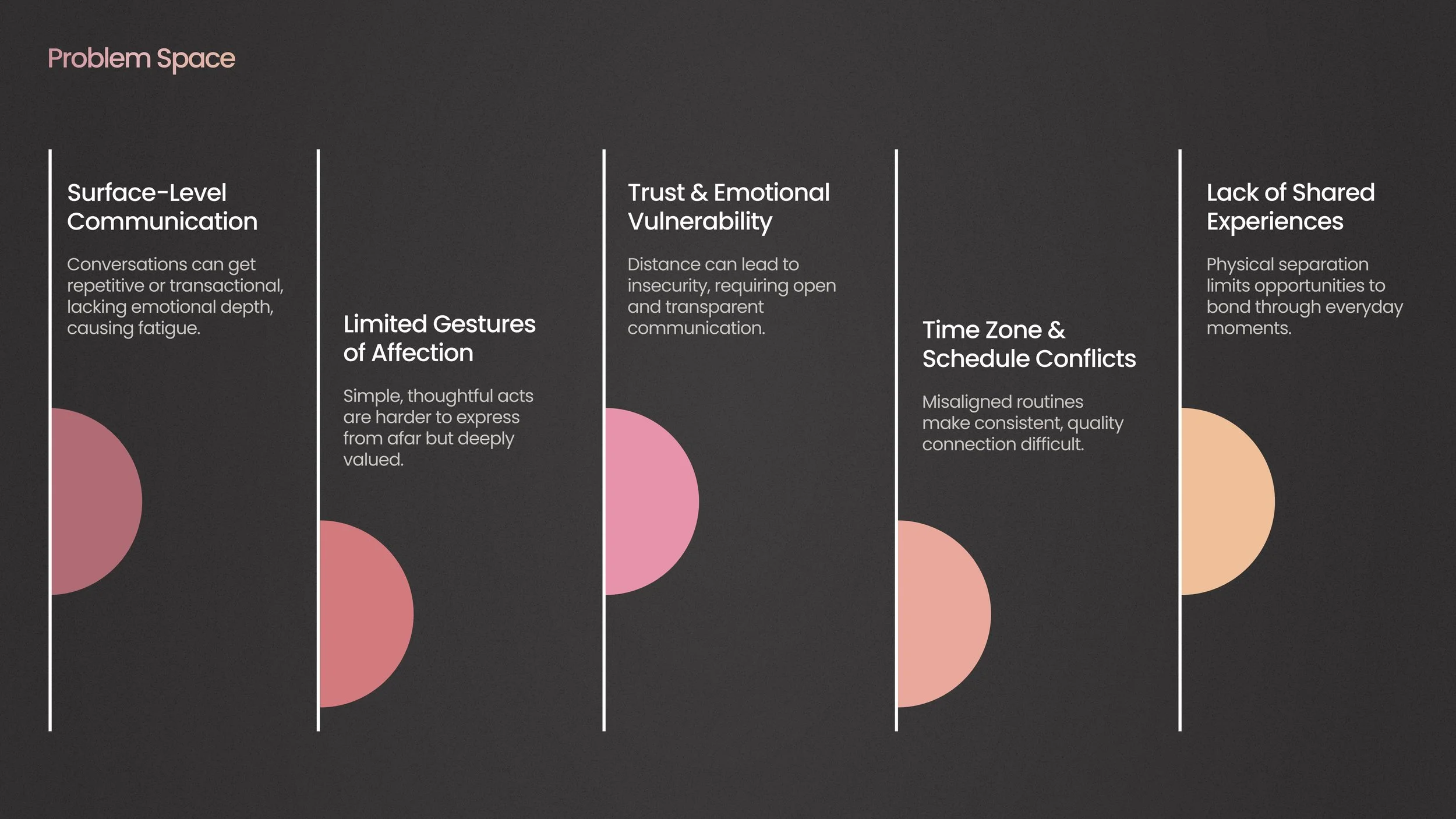 XOXO helps long-distance couples overcome emotional distance by providing fun tools for more meaningful communication through creating shared experiences, utilizing technology efficiently, personally, and in a healthy manner, despite their physical distance and limited time with individual lifestyles.