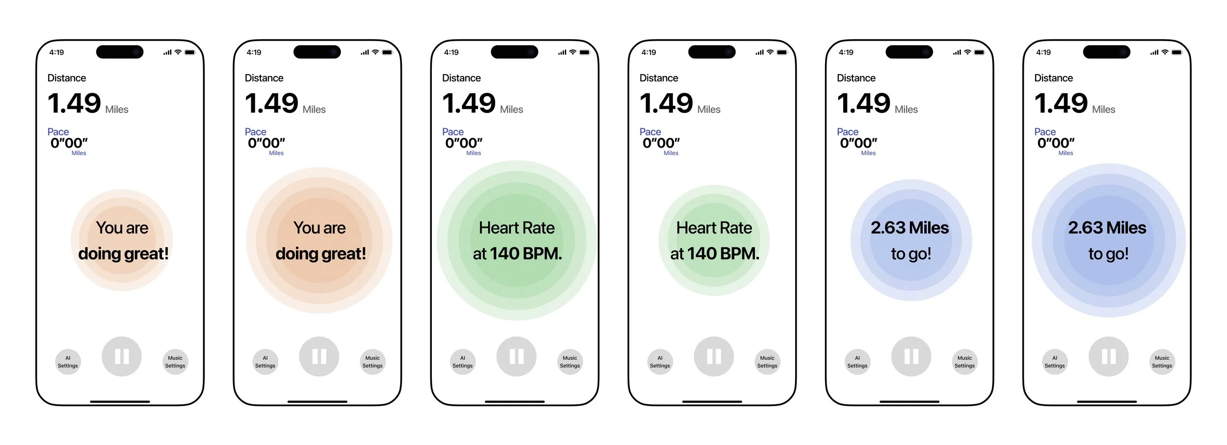 During the run, users can track progress, pause or stop, adjust music, and modify the AI’s guidance. The interface also provides audio progress updates and positive feedback based on performance improvements.