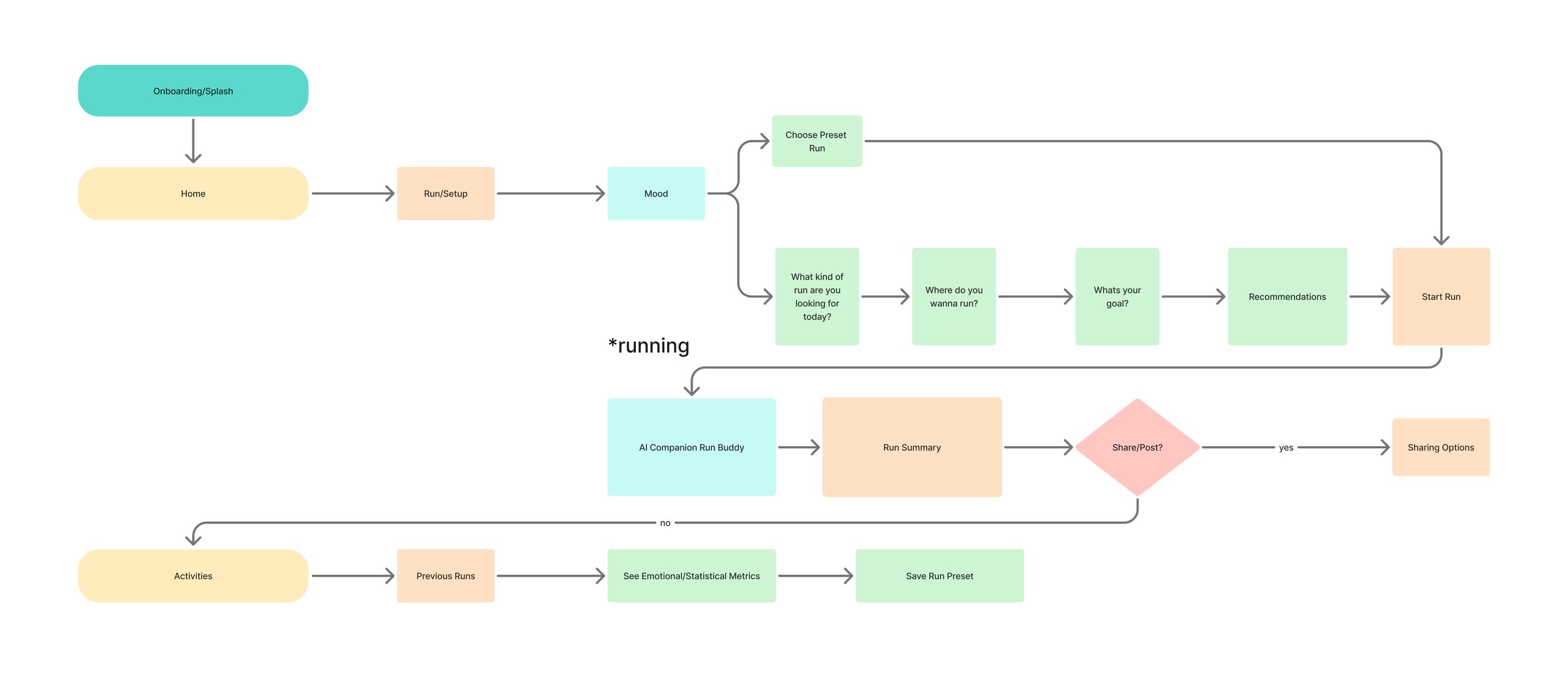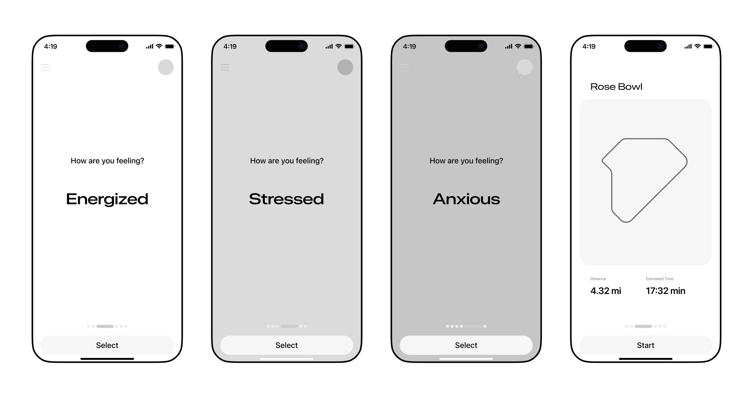 Before the run begins, the app invites users to check in with their mood, allowing AI to shape routes, distance, and tone accordingly. Reduces pressure and aligns the experience with the user’s emotional needs.