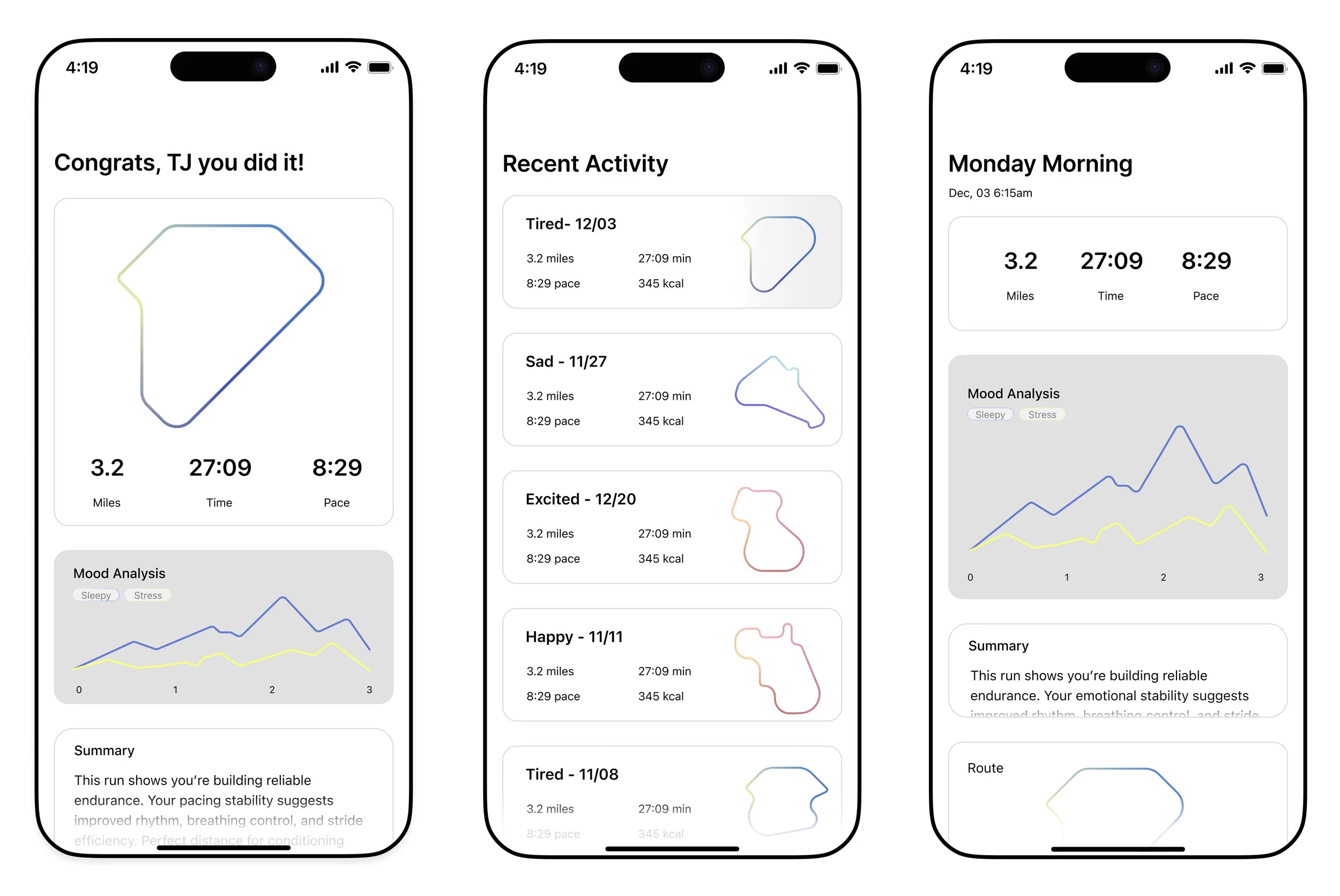 After the run, the app provides a clear summary of distance, pace, time, and route, along with an AI-generated mood analysis that reflects emotional changes.