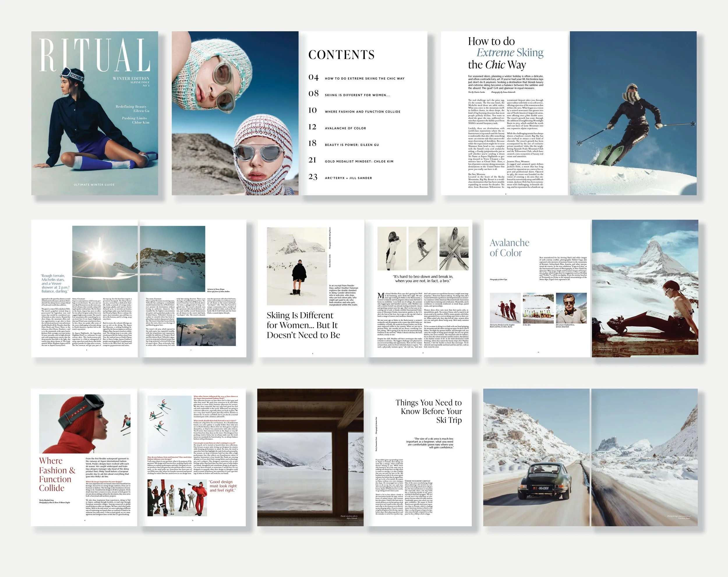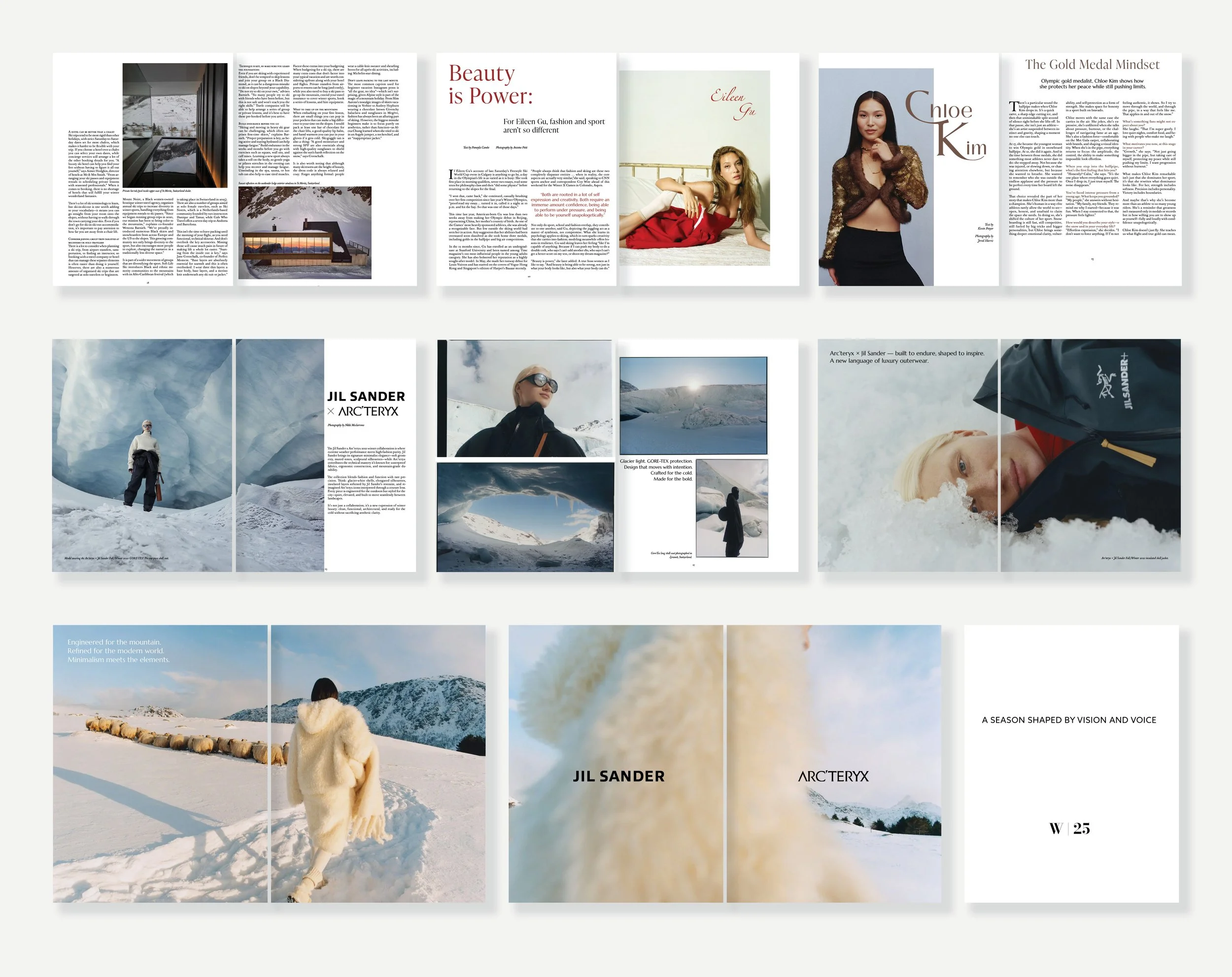 This Magazine issue explores lifestyle, fashion, and travel through the lens of winter sports, including skiing and snowboarding. The content highlights the elegance of cold-weather style, the movement and energy of alpine sports, and the sense of luxury associated with seasonal escapes.